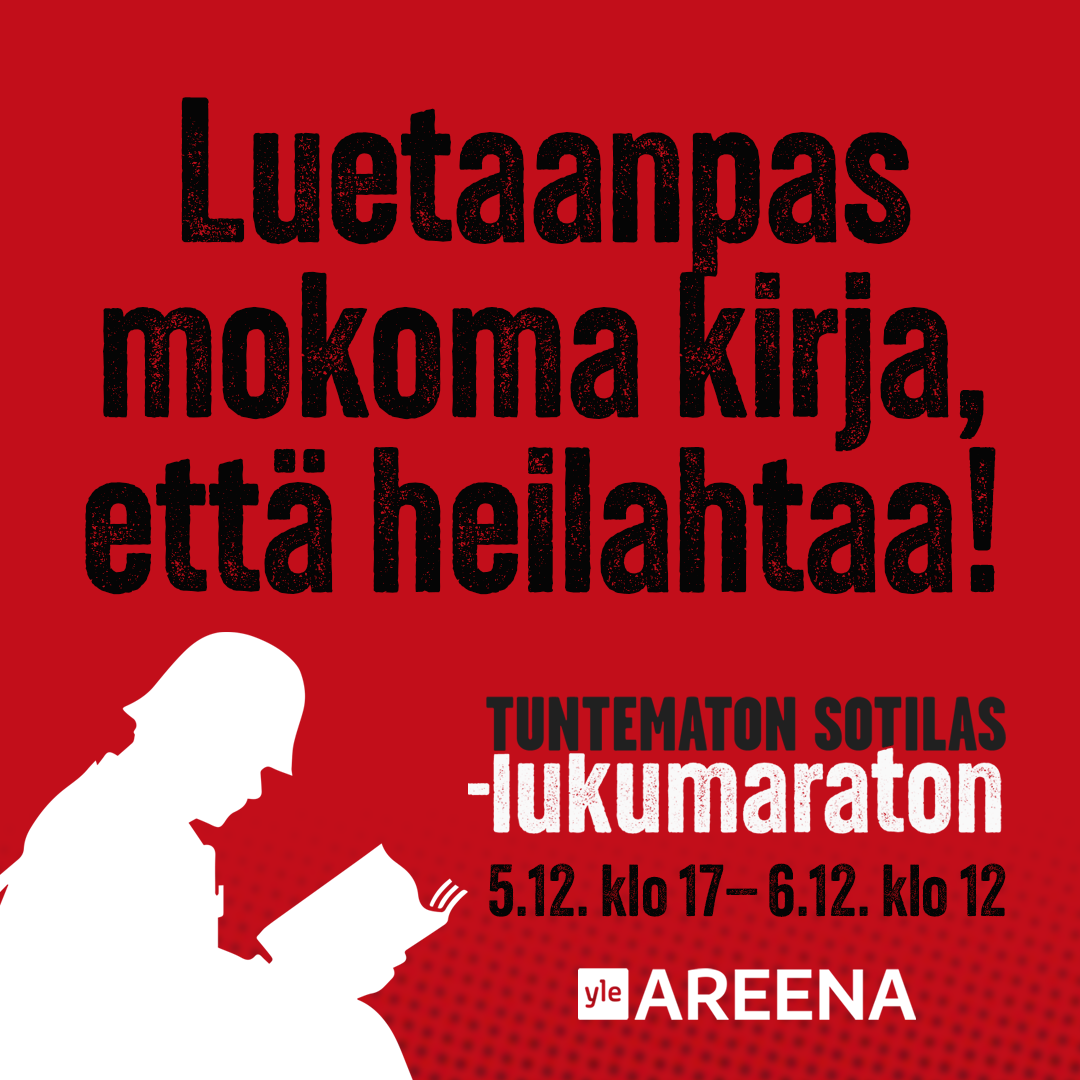 Tuntematon sotilas -lukumaraton tulee eli itsenäisyyspäivän aattona to 5.12. klo 17 Yle Areenassa iso, moninainen joukko alkaa lukea Väinö Linnan 70 vuotta täyttävää romaania alusta loppuun. Lukeminen kestää yli 20 tuntia eli jatkuu yön yli.