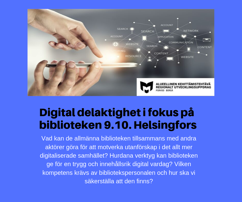 Vaikuttaako digitaalinen murros työhösi? Uskaltaudutko kielikylpyyn? Osallistu ruotsinkieliseen koulutuspäivään, jonka aiheena on digitaalinen osallisuus ja kirjastot. Tarjolla asiantuntijoiden näkemyksiä ja käytännön vinkkejä digiopastukseen ja osaamisen kehittämiseen. Paikalla mm. Ruotsista yleisten kirjastojen kirjastohenkilökunnan digiosaamisen kohottamishankkeen vetäjä Kerstin Olsson. Lisätietoja alla ruotsiksi.