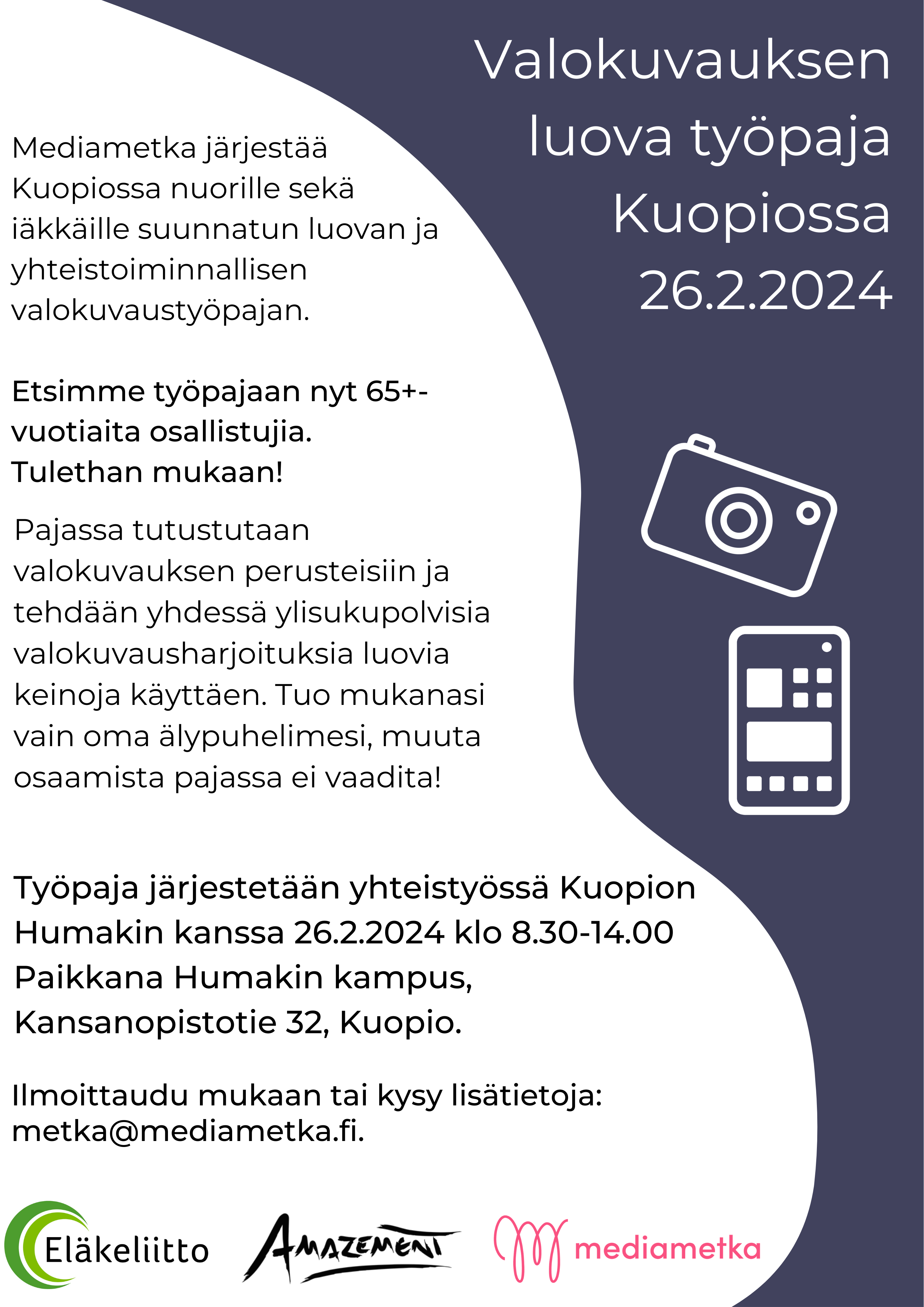 Mediametka ry järjestää nuorten ja iäkkäiden ylisukupolvinen luovuus -työpajan Kuopion Humakissa. Etsimme työpajaan iäkkäitä osallistujia (65+), joita kiehtoo oppia uudenlaisia mediataitoja ja tehdä ylisukupolvista yhteistyötä nuorten kanssa.
