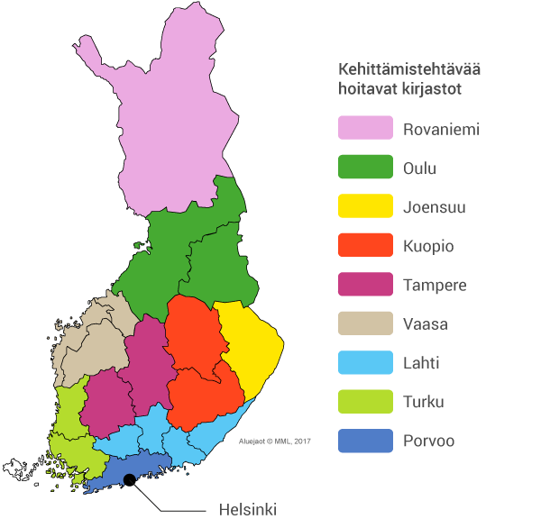 1.1.2018 voimaan astuneen Opetus- ja kulttuuriministeriön asetuksen mukaisesti valtakunnallista kehittämistehtävää hoitaa Helsingin kaupunginkirjasto. Alueellisia kehittämistehtäviä hoitavia kirjastoja on yhdeksän. Valtakunnallisella ja alueellisella kehittämistehtävällä korvataan aiempi keskus- ja maakuntakirjastojärjestelmä.