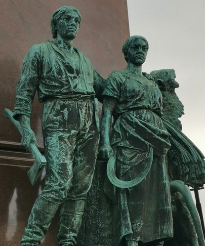 Aleksanterin patsaan alaosassa on vaikka mitä, mm. pariskunta joka kerää viljasatoa sirpin ja kirveen avulla.