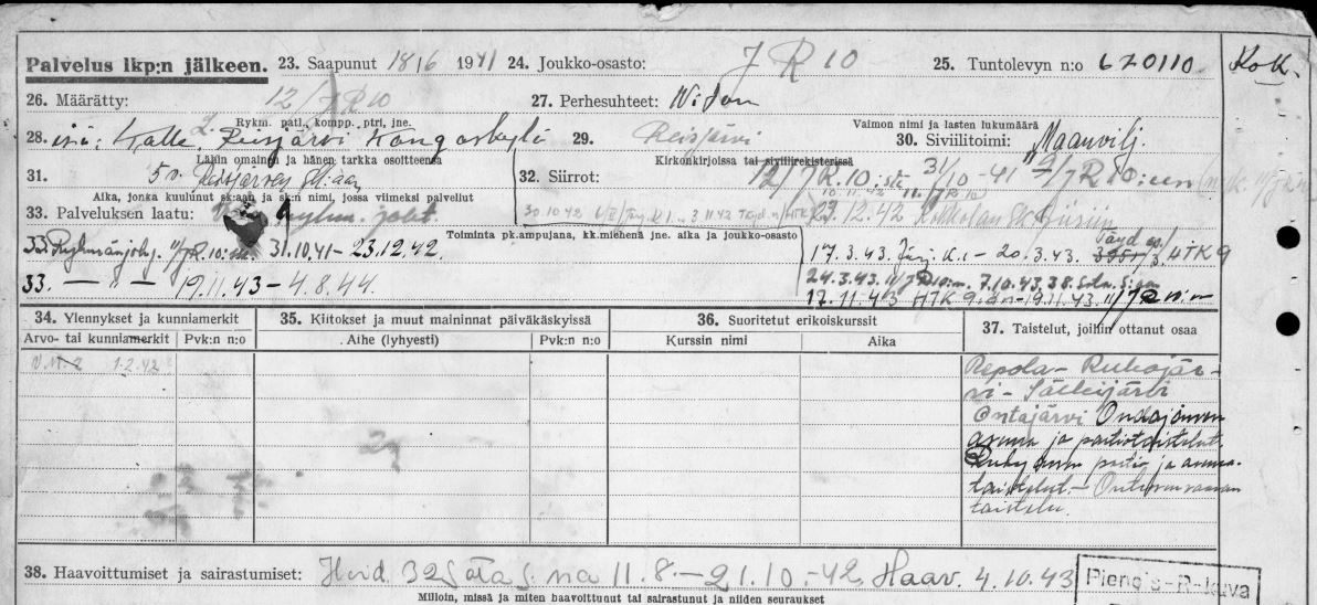 Kantakortissa on jatkosodan lkp:n yhteydessä kutsutulle sotilaalle yksiköksi määrätty 12./JR 10. Sieltä hänet on 31.10.1941siirretty 9/JR 10 ja 9 on vedetty yli ja tilalle laitettu 11; lisäksi sulkeisiin on kirjoitettu (nyk. 11/JR 10). Tämän jälkeen hän on aina HTK-reissujen yms. jälkeen palannut yksikköön 11/JR 10.
