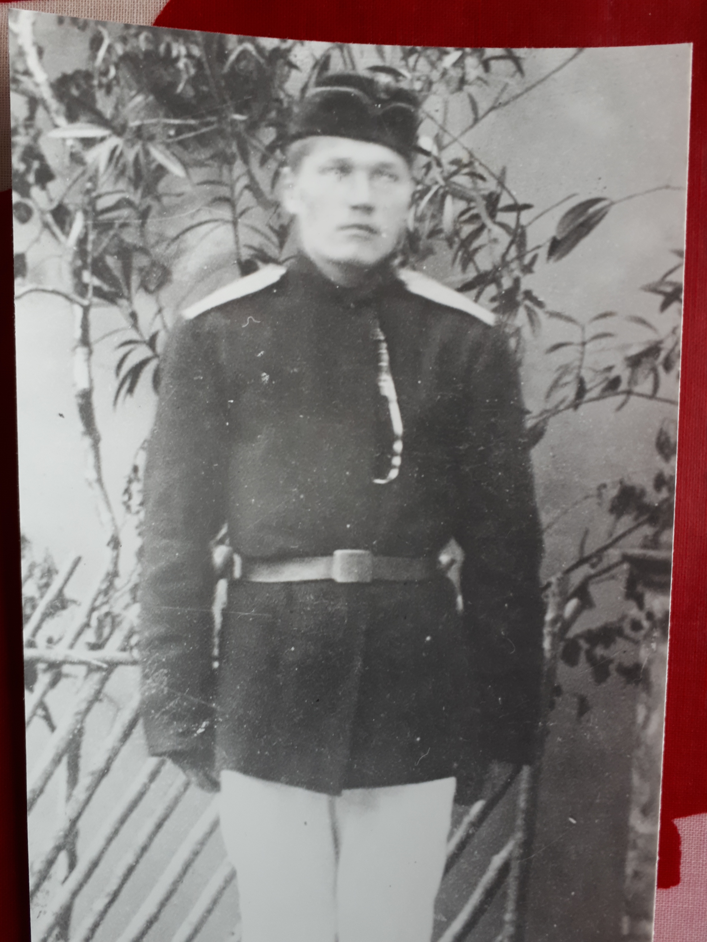 Todennäköisesti kyseessä on Suomen ns. vanhan sotaväen sotilaspuku autonomian ajalta. Vastaava asukokonaisuus oli käytössä reservikomppanioilla 1880-1890-luvuilla. Ole Gripenberg kertoo teoksessaan "Finsk krigsmannabeklädnad genom fyra sekler" (WSOY 1966) että kyseiset valkoiset housut olisi tunnettu piimähousujen nimellä ja lakki piirakkamyssynä. Lakkityyppi olisi Gripenbergin mukaan jäänyt pois käytöstä n. vuonna 1892, mikä tarkentaa kuvan ajoitusta.