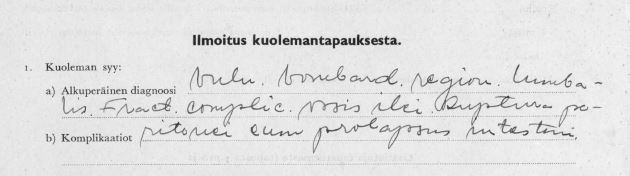 Mikähän tuo kuolinsyy on? Liittyykö pommituksessa lantion seudulle saatuihin vammoihin?