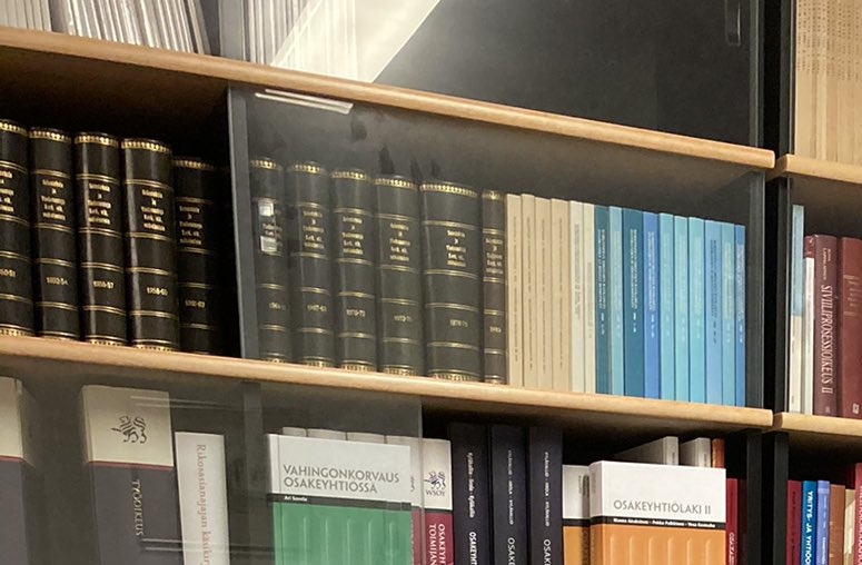Mikä on liitteen kuvan kirjahyllyssä oleva tumma, kovakantinen kirjasarja, jossa on kullanvärisiä raitoja ja vuosiluvut? Kirja löytyy lakimiesten kirjahyllystä eli se on jokin oikeustieteeseen liittyvä "vuosikirja". Voisi ehkä olla esim. vanha versio korkeimman oikeuden ratkaisuista tai jonkin oikeustieteellisen lehden vuosikerta tai jotakin vastaavaa.