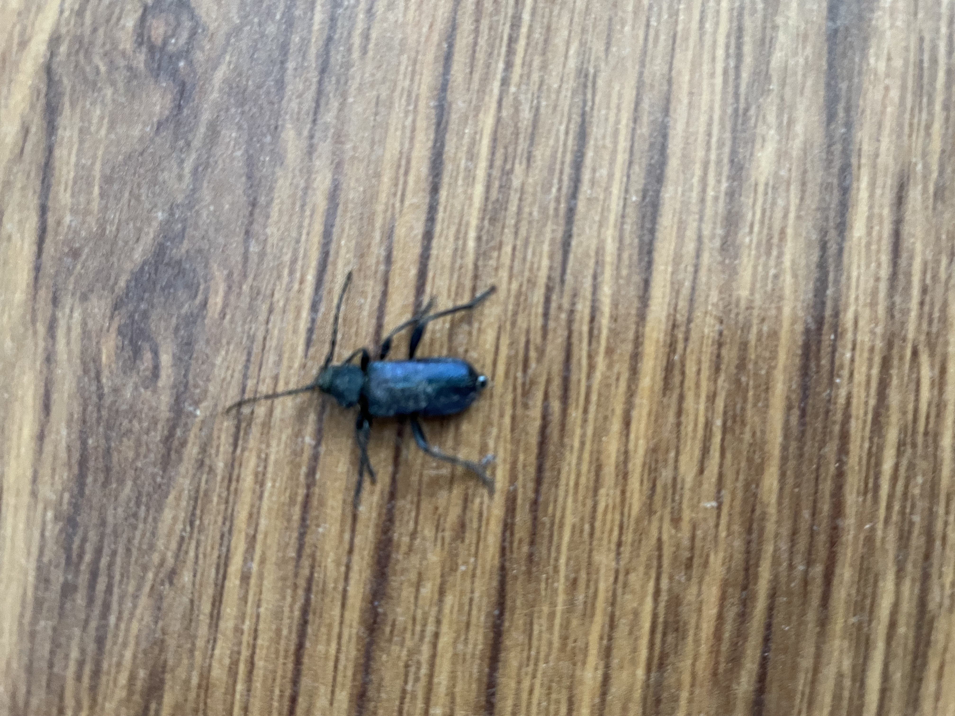 Tein lähettämästäsi kuvasta käänteisen kuvahaun lataamalla kuvan Googlen kuvahakuun. Hakutulosten perusteella kyseessä on todennäköisesti kovakuoriainen nimeltä papintappaja (lat. Callidium violaceum). Kuvia ja esiintymistietoa papintappajasta löytyy mm. Suomen lajitietokeskuksen Laji.fi-verkkosivustolta: https://laji.fi/taxon/MX.195154