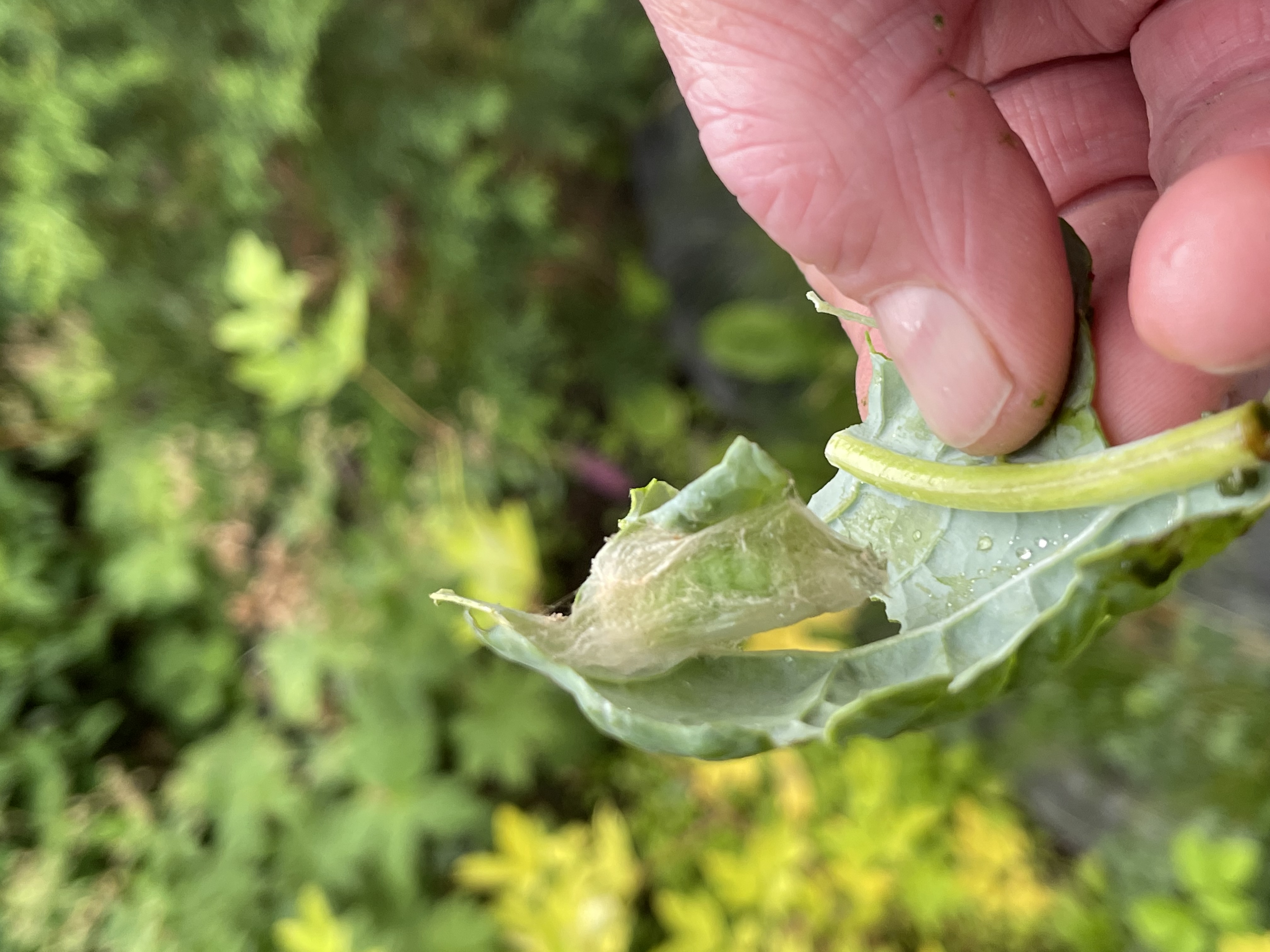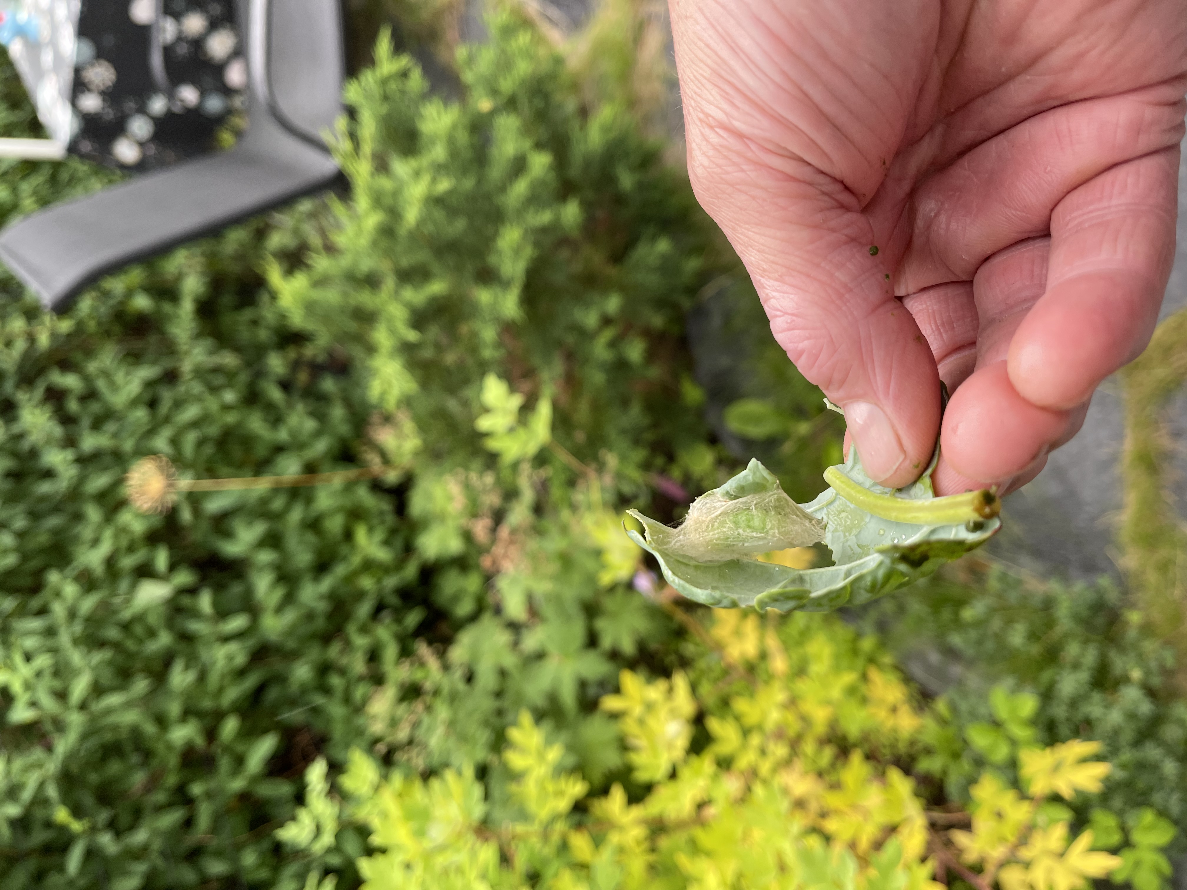 Minkä perhosen toukka? Löytyi lehtikaalin lehden alapuolelta. Seek-luontotunnistinsovellus ilmoitti sen olevan erittäin harvinaisen tupsumetalliyökkösen, mutta Seek on erehtynyt melko useinkin. Nyt viikon päästä toukka näyttää kehittäneen ympärilleen seittiä.
