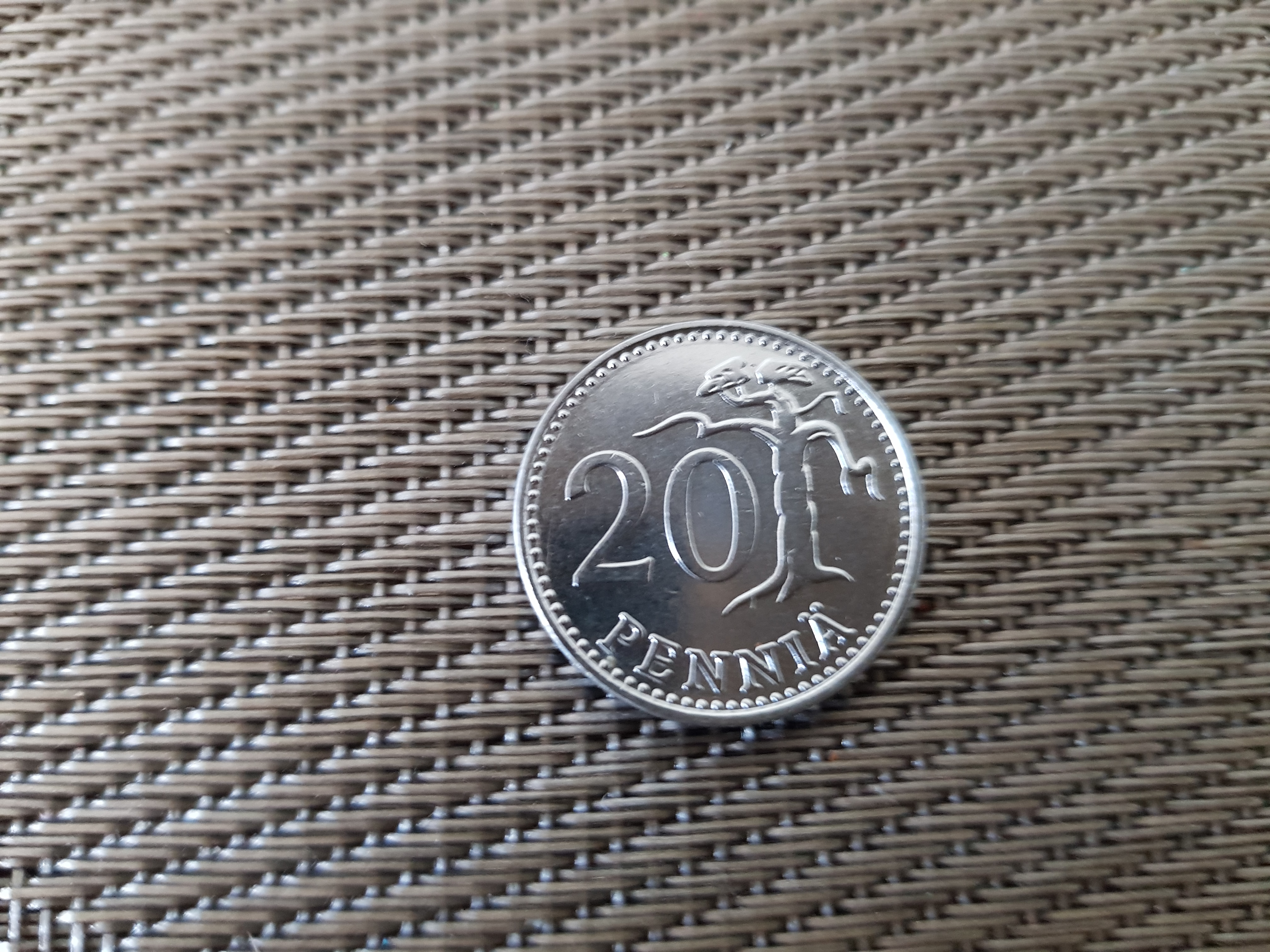 Suomen Numismaatikkoliiton julkaiseman luettelon "Suomen kolikot ja setelit n. 1400-2016" mukaan v. 1979 lyötiin 20 pennin kolikkoa 7 713 000 kappaletta. Virheettömän, täysin leimakiiltoisen kolikon arvoksi on luettelossa annettu 0,50 €. Kolikon valmistusmateriaali on alumiinipronssia (930 Cu, 50 Al, 20 Ni), kolikon paino on 4,5 g ja läpimitta 22,5 mm. Valokuvan perusteella emme osaa sanoa onko kyseessä juuri tuo kolikko. Rahojen arviointia tekevät mm. Suomen Numismaattinen yhdistys ja useat huutokauppahuoneet. Kannattaa kysyä heiltä.