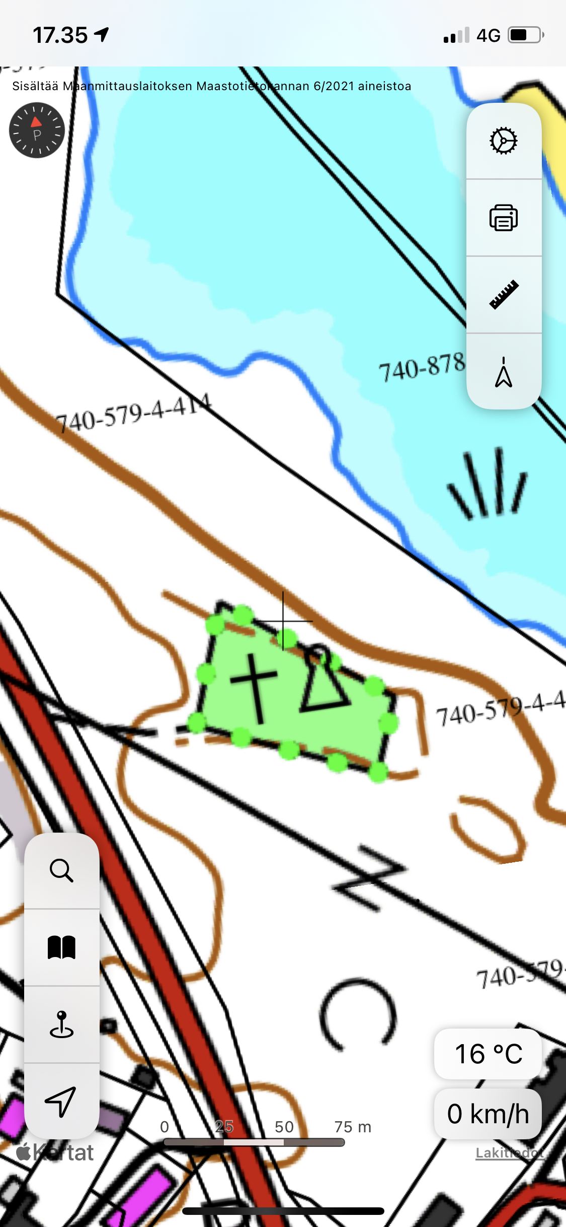 Aluetta ympäröivät vihreät täplät lienevät puita. Suomen Suunnistusliitto esitteli vuonna 2017 uusia karttamerkkejä, joissa vihreän ympyrän kerrotaan olevan puun karttamerkki: