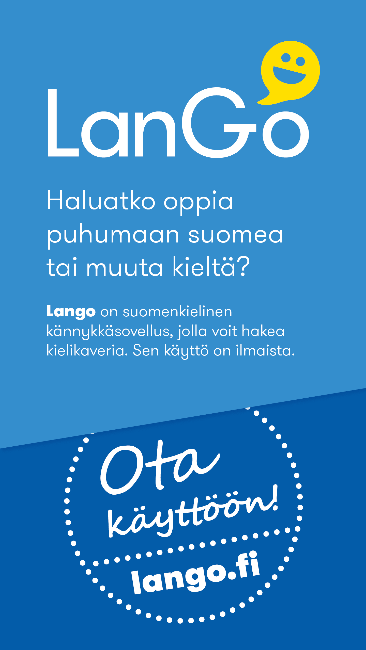 Lango är en finskspråkig app som gör det möjligt för den som vill öva sig i ett främmande språk att hitta lämpliga samtalskamrater. Appen kan tas i bruk på adressen lango.fi. Den kan användas i telefonen, i en pekplatta eller i en dator.